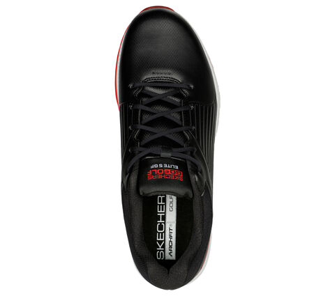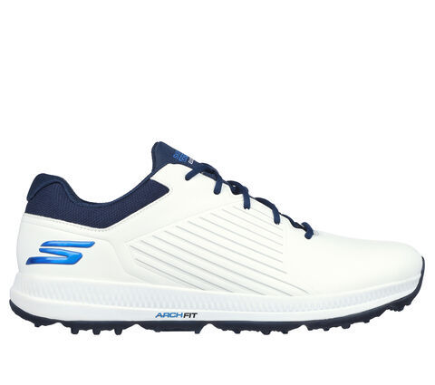Handle the course in supportive comfort and smooth style with Skecththers GO GOLF® Elite 5 - GF. This waterproof lace-up golf design features a quarter embossed synthetic upper with a removable Arch Fit® insole and lightweight ULTRA FLIGHT® cushioning.