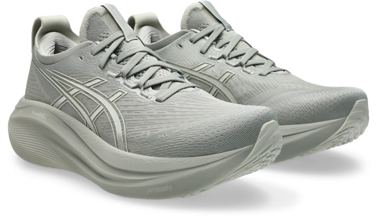 The GEL-NIMBUS? 27 shoe's soft cushioning properties help you feel like you're landing on clouds. This design is revamped to help create a softer and smoother running experience.?A soft engineered jacquard mesh upper comfortably wraps your foot while supplying advanced ventilation. Additionally, the knit tongue and collar help provide a soft and supportive feel.?By using FF BLAST? PLUS ECO cushioning, this trainer creates a lighter and softer cushioning experience.?Lastly, HYBRID GRIP? outsole rubber helps create better traction, improved softness, and advanced durability.